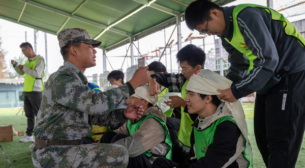本次素质拓展活动包括军事技能训练、应急救治实操和团队协作拓展等实践内容。在军事技能训练中,学生们重温了站军姿、停止间转法,参与了模拟射击,近距离感知现代战场技术;应急救治课程采用“理论+实操”模式,教官系统讲授三角巾包扎、止血带使用及心肺复苏技能,学生两两分组反复练习标准流程;在团队拓展环节,学生们在旱地冰壶赛道上研讨战术布局,通过推杆力度和路线选择的协作博弈,凝聚团队默契。