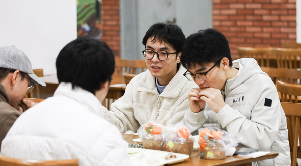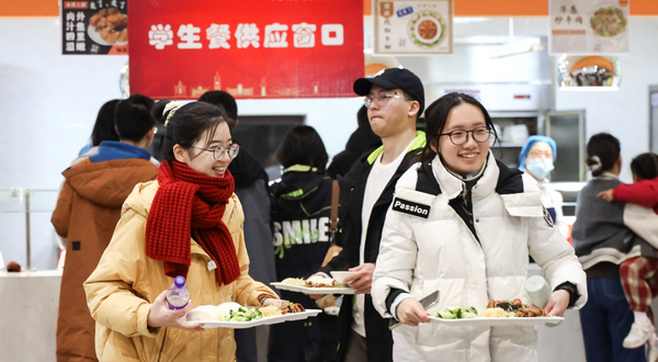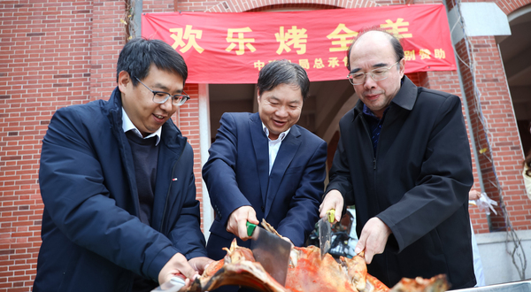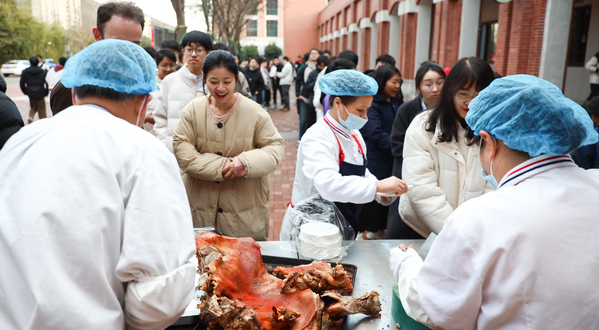随后,“欢乐烤全羊”和迎新餐活动先后展开。随着中建八局总承包公司捐赠的10只全羊摆上烤架,烤羊肉的香味就弥散开来。大家有序排队领取、分享,共同交流舌尖上的美食文化。为准备本次迎新餐,学院总务部的老师们事先征集了学生们的意见建议,并从中精选了几样最受期待的菜品,交由食堂大厨精心设计和烹制。这几款寓意马年“蒸蒸日上、蹄疾步稳”的迎新餐,深受同学们欢迎。